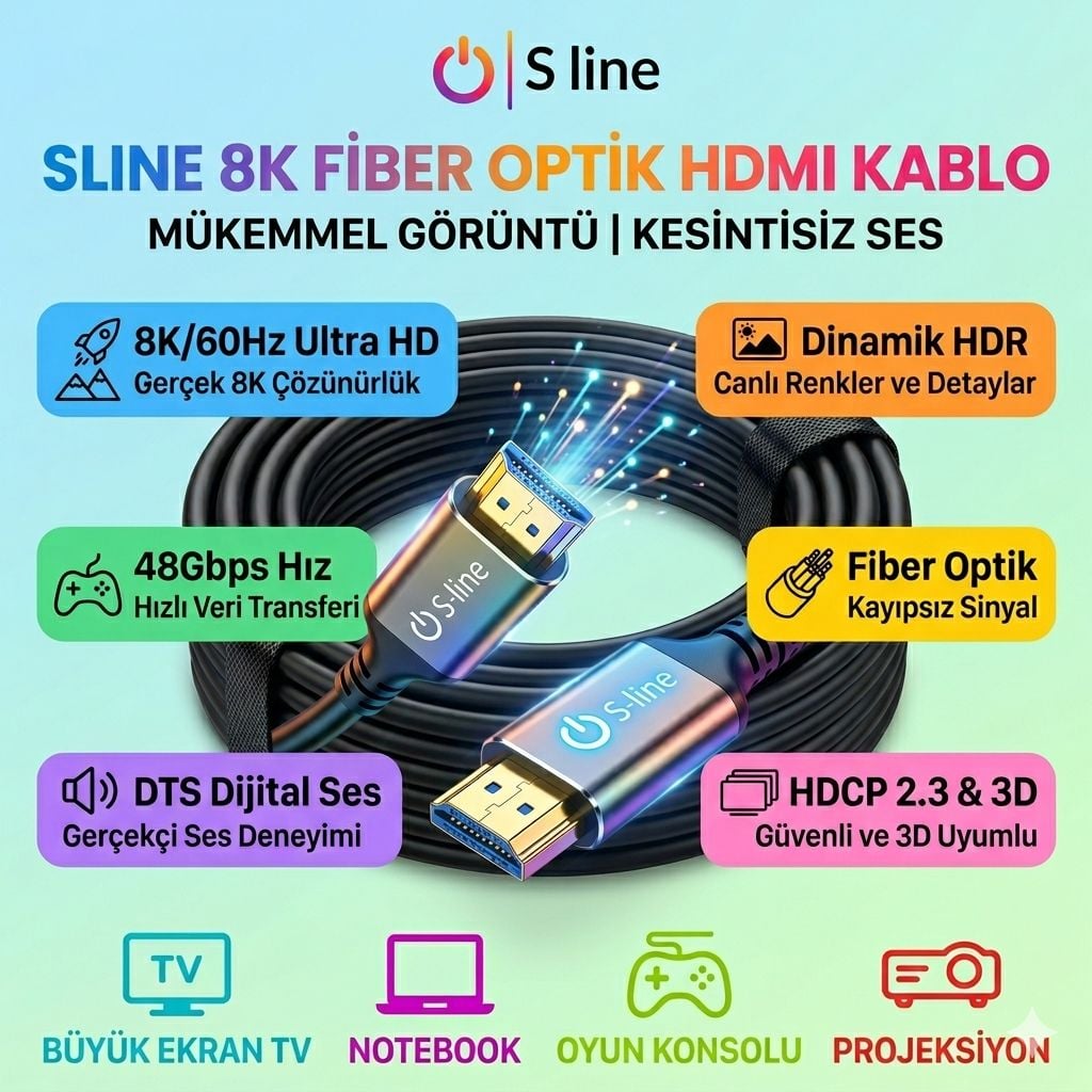Sline 8K Fiber Optik 2.1 HDMI Kablo, uzun mesafelerde yüksek çözünürlüklü görüntü ve kesintisiz ses aktarımı için tasarlanmıştır.